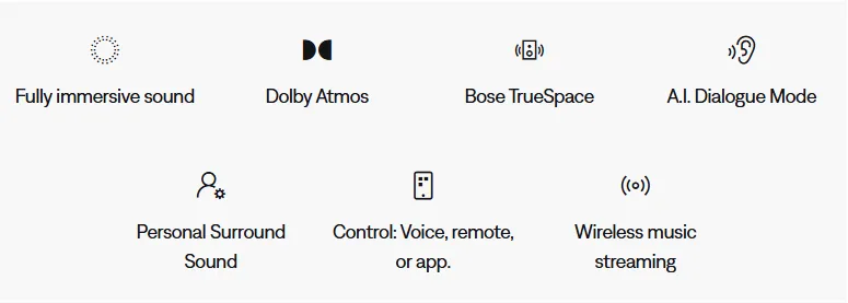 The Bose Smart Soundbar is designed for customers looking for better performance for all their movies, music, and gaming. The compact soundbar provides spacious/immersive sound leveraging Dolby Atmos decoding. And for non-Atmos encoded content, Bose TrueSpace spatial processing provides an immersive experience. Plus, all the dialogue will be amazingly clear and crisp with A.I. Dialogue Mode, which automatically senses when dialogue is occurring and adjusts the tonal balance to improve the clarity of spoken words in all content without sacrificing immersive elements and effects.