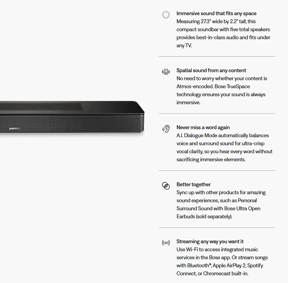 Dolby Atmos, exclusive Bose TrueSpace technology, and upward-firing transducers deliver shockingly immersive sound for a soundbar of this size.